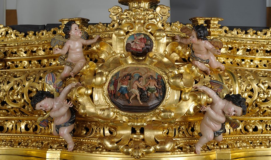 The float, the oldest currently in penitential station in Andalusia, underwent a meticulous restoration at the Andalusian Institute of Historical Heritage (IAPH) almost three decades ago, an internationally recognized conservation institution dependent on the Ministry of Culture and Sports. The intervention allowed the aesthetic values of a float suffering from significant support and polychromy issues to be reintegrated. After the process, it regained its dimension as a microarchitecture of great artistic quality, with its imprint of matte gold, the transparency of the latticework of the basket, and the combination of stuccoed and gilded surfaces that give it its characteristic theatrical and Baroque setting.